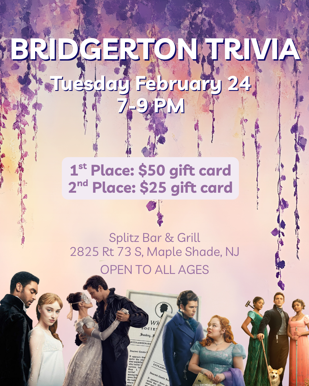 You and your closest confidants are cordially invited to join us for Bridgerton Trivia to test your knowledge of the Ton. The diamonds of the season will receive a $50 and $25 gift card for 1st and 2nd place.