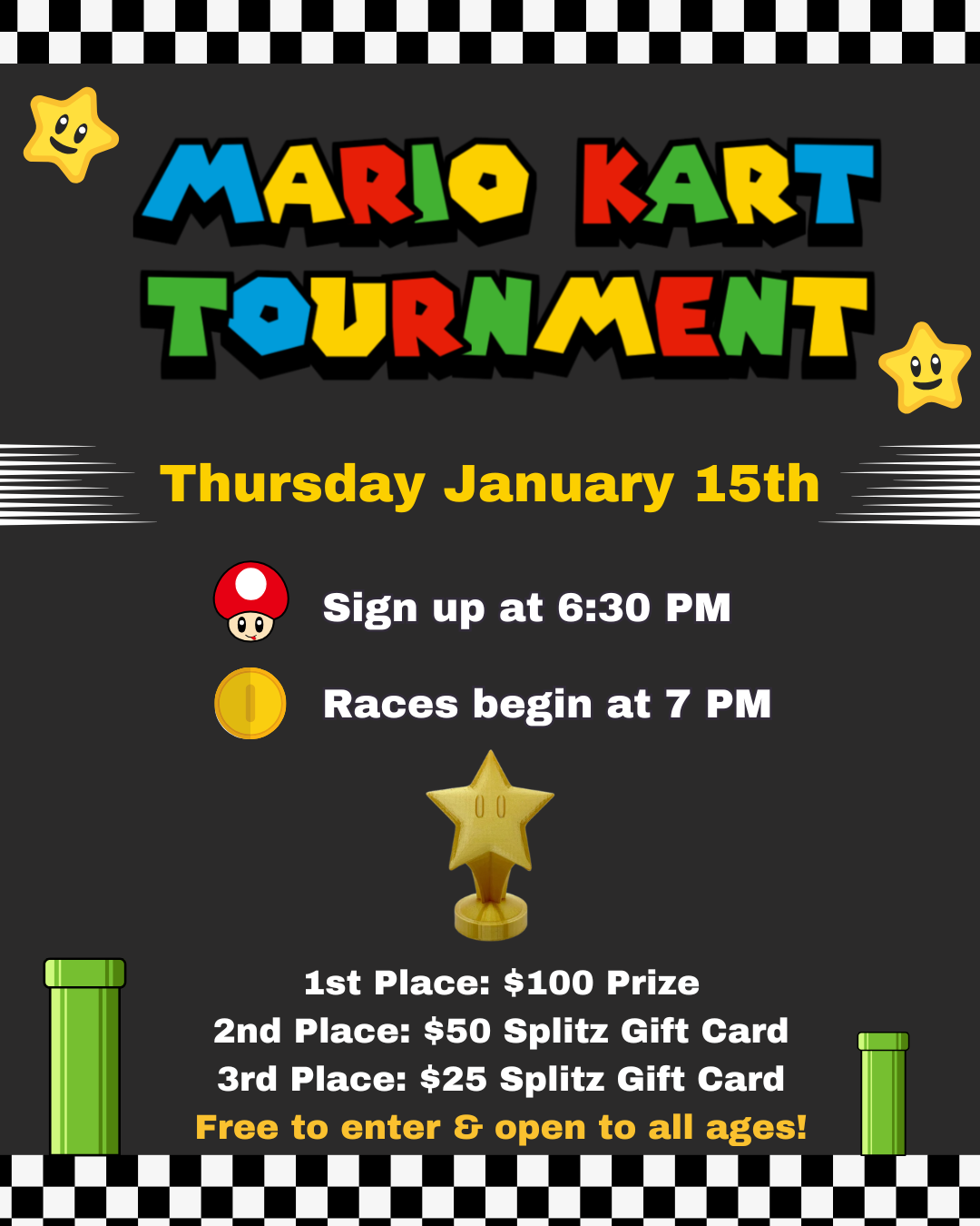Start your engines & come ready to race! This is an all ages Mario Kart Tournament on the Nintendo Switch. The 1st place winner will take home $100 while 2nd and 3rd place will receive a $50 and $25 Splitz gift card.
