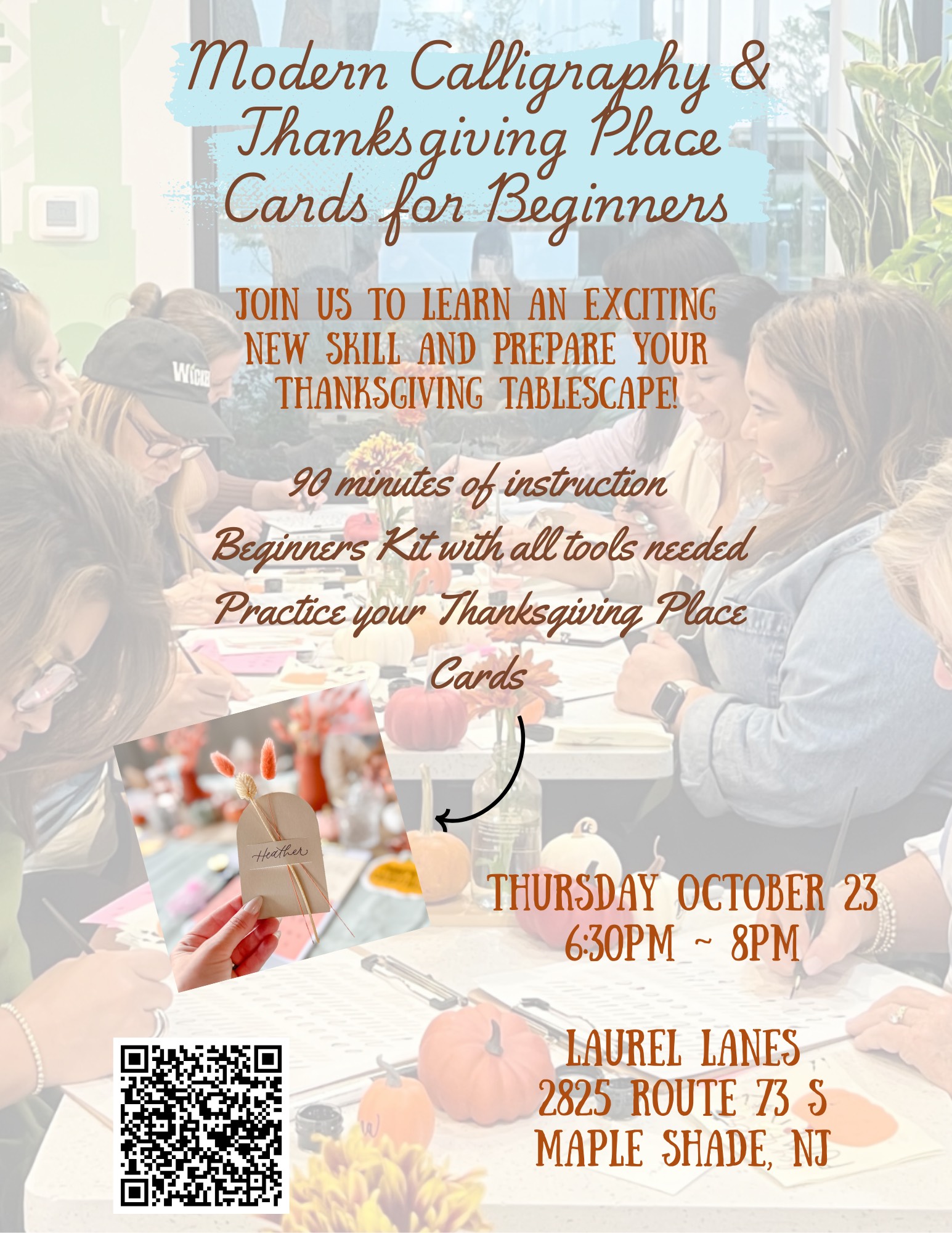 Join us for a festive workshop of spooky fun and pretty lettering for beginners! Class includes 1.5 hours of instruction and demonstration, our beginner’s calligraphy kit (two nibs, black ink pot, 2 letter guides, tracing paper and straight pen holder), and all materials to write on. Everything is yours to keep at the end of the workshop! Additionally, we will be lettering on faux pumpkins at the end of our class time! Tickets required: https://sipandscript.com/event/modern-calligraphy-and-pumpkin-lettering-for-beginners-at-laurel-lanes/