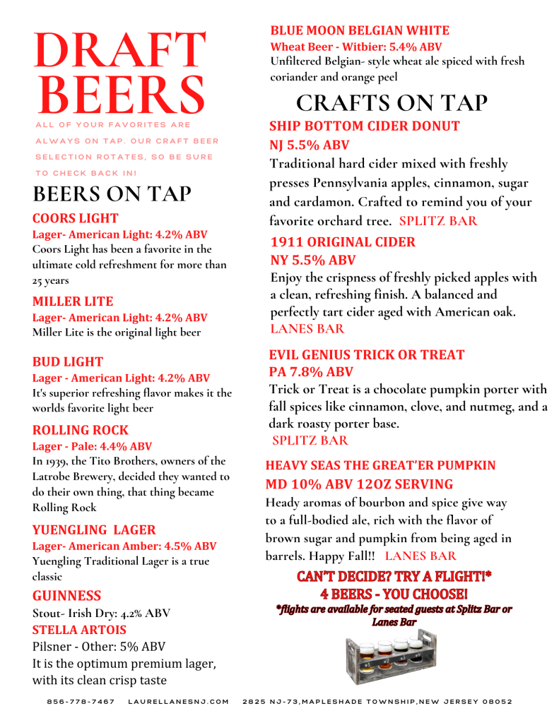 Featuring an american grill fare menu. At our two full bars, enjoy seasonal craft drafts, cocktails, wine, and beer indoors or on our outdoor patio. Delivered straight to your table, at the bar, or even on the lanes!