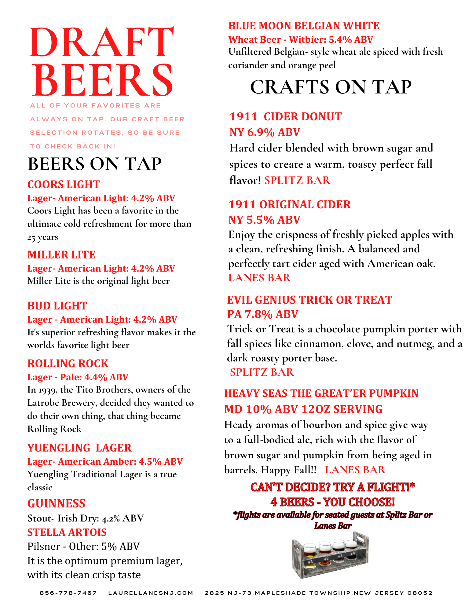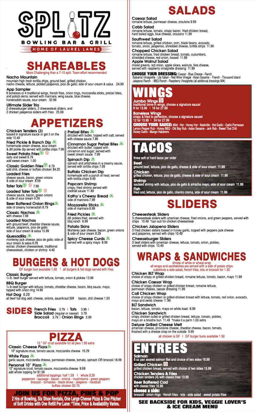 Featuring an american grill fare menu. At our two full bars, enjoy seasonal craft drafts, cocktails, wine, and beer indoors or on our outdoor patio. Delivered straight to your table, at the bar, or even on the lanes!